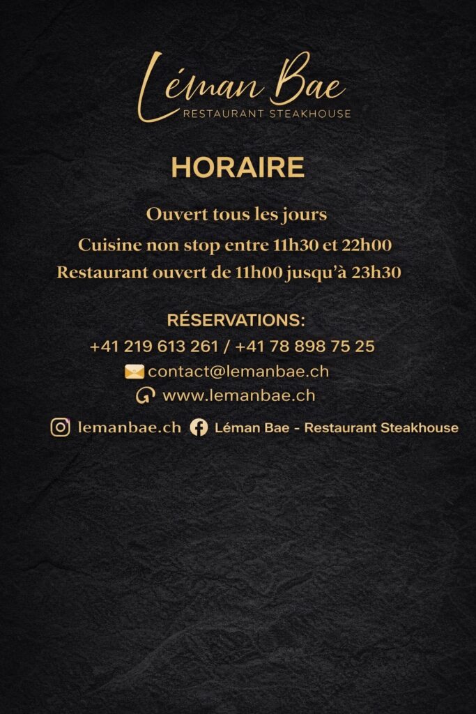 Leman Bae, Restaurant Steakhouse votre petit coup de cœur dans la Riviera. Restaurant familiale, à deux pas du château de chillon avec une vue imprenable sur le lac Leman vous propose des plats préparés avec des produits frais, de qualité supérieure, cuisinés avec plein d’amour par nos chefs. Dès les viandes exceptionnelles comme le bœuf Angus Suisse, au entrecôte wagyu, au bœuf et poulet HALAL, jusqu’aux seiches croustillants et les filets de perche, accompagnés de frites maison, en passant par une vaste gamme de vins sélectionnés, locaux et du monde entier. Notre équipe est ravie de vous faire voyager au paradis à travers des vôtres papilles gustatives.